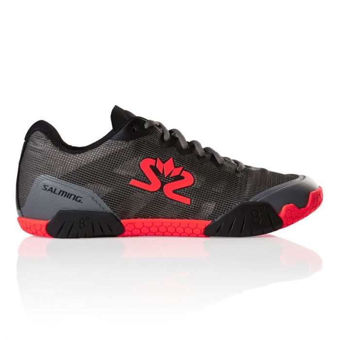 De Salming Hawk Fluo-Yellow Black is het nieuwste paradepaardje van dit Zweedse merk. Los van de looks, zoals de kleurstelling en de doorzichtige zool met daarin een afbeelding van een havik, zit de schoen als gegoten, mede door de "ExoSkeleton™" techniek waardoor je de schoen als het ware om je voet heen trekt.